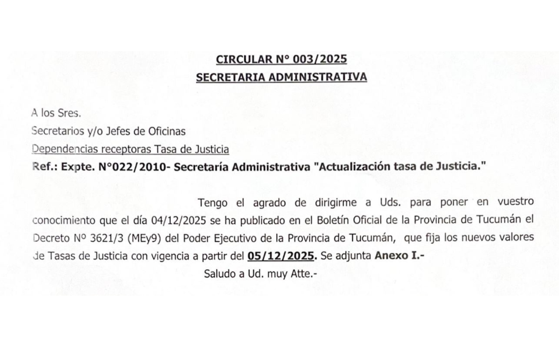 Circular de Secretaria Administrativa N° 003-2025 | Valores tasas de Justica 05-12-2025